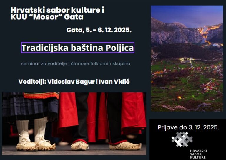 The Cultural and Artistic Society “Mosor” from Gata, in collaboration with the Croatian Cultural Assembly, the SKUD of Split-Dalmatia County, and with the support of the Town of Omiš, is organizing a two-day seminar on the folklore heritage of Poljica. The instructors are eminent Croatian folklorists and choreographers Vidoslav Bagur and Ivan Vidić. The seminar […]