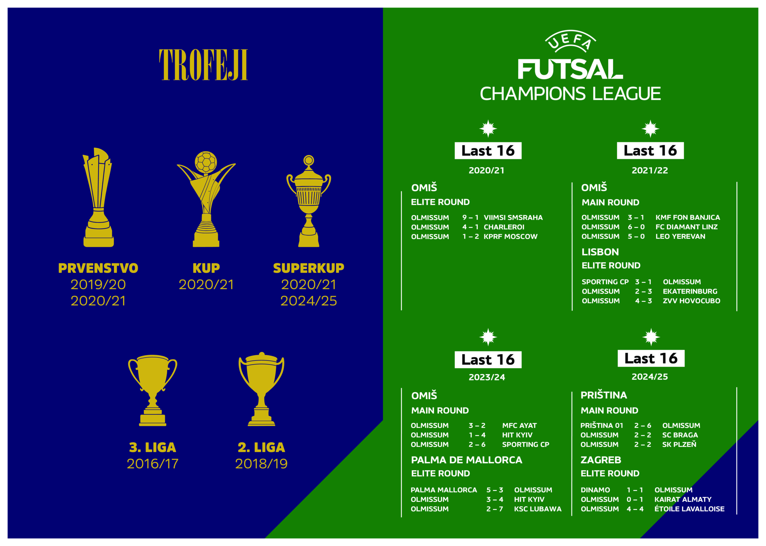 • 2024/2025 Deseta sezona, osvajanje SuperKupa, plasman među 16 najboljih momčadi u Europi (Elite round) - UEFA CHAMPIONS LEAGUE